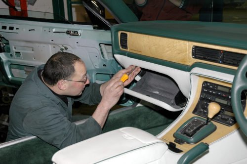 The team, led by SVO Manager Frank Marsden and Principle Engineer Gary Albrighton, took a standard example of the Jaguar (Daimler) X300 saloon and started to work their magic, first they stripped out the interior and then everything else until they had a bare shell standing in workshop. The roof was then taken off; it says much for the structural strength of the X300 that very little was needed to keep the body rigid. Then the entire car was shortened by 150 mm (6 inches); as the body was now not standard, doors and glass had to be specially made by SVO.