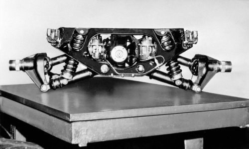 The strong structure of the Coupé is clear in this image. From the central tub the triangulated sub-frame to which the engine, gearbox and front suspension were attached.