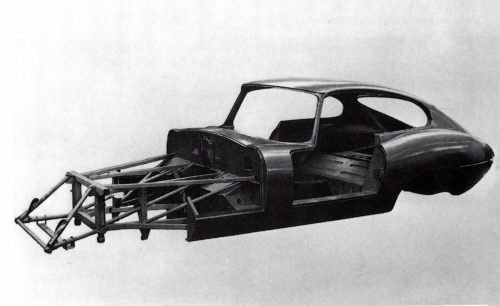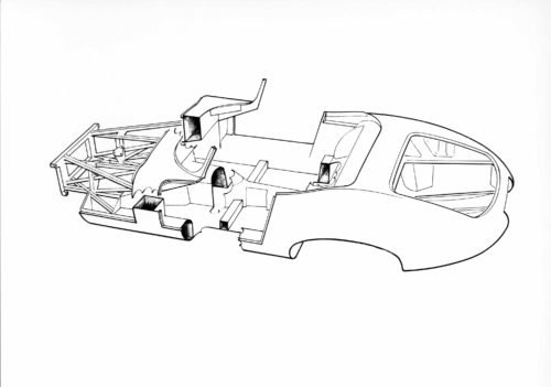 A line drawing of the E-Type monocoque and engine subframe. It was issued at the time of the launch and shows the light and strong structure to advantage.