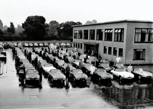 Thought to be the first production batch of right-hand-drive Open Two Seaters, there are fifty-four E-Types ready to depart Browns Lane on a rainy July (1961) day. They are all, apart from a couple that are visible, fitted with trade plates.
